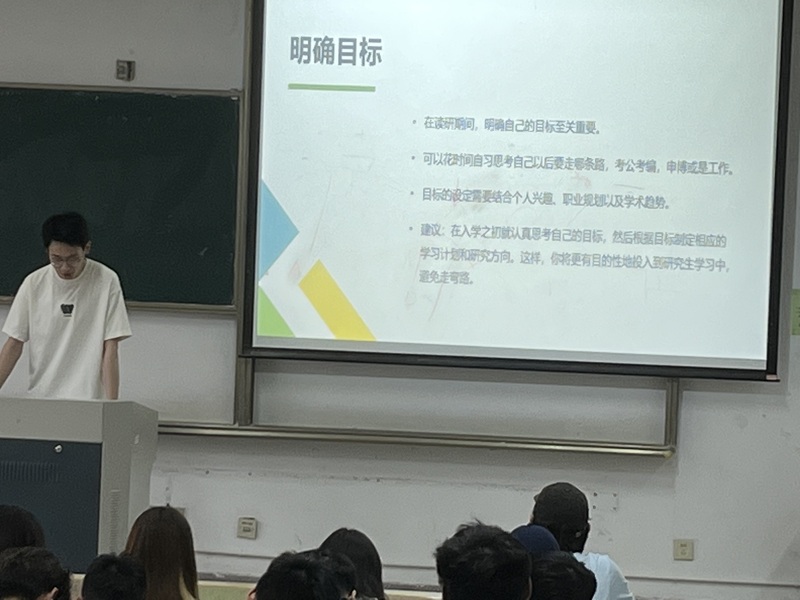 永利集团官网2021级研究生吴婷、花锐东、叶沛林分别讲述了自身的学习经历。吴婷从学术论文、学科竞赛、硕士考试、博士申请流程进行了分享,建议大家多阅读顶会顶刊,尽早掌握本专业基本软件,了解自己的研究方向;花锐东从升学流程及时间规划、联系导师、科研计划、综合考核四个部分进行了经验分享,重点强调了明确自身节奏目标的重要性;叶沛林就升学要求方面作重点介绍,提出要认真研读目标院校的招生简章和招生目录,并用表格总结相应高校的申请条件,鼓励同学们要勇于尝试。