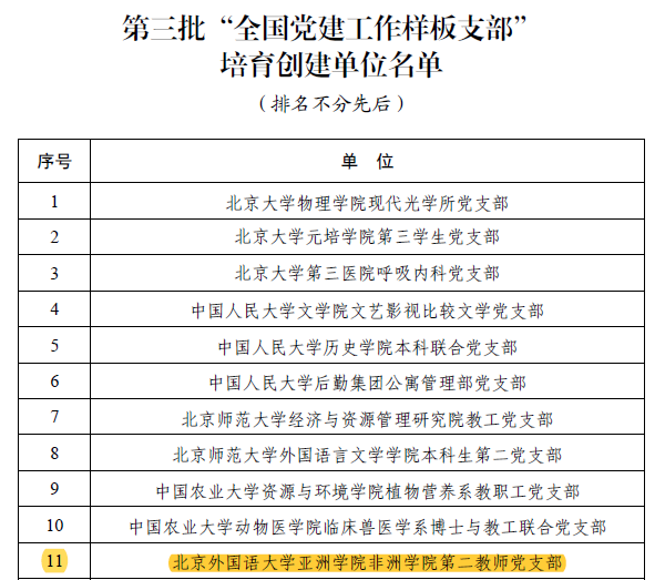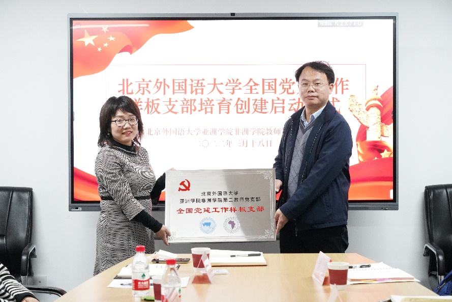 党委宣传部副部长、新闻中心负责人王薇薇宣读了《教育部办公厅关于公布第三批全国党建工作示范高校、标杆院系、样板支部培育创建单位名单的通知》。党委组织部常务副部长冯刚为beat365英国官网网站非洲学院教师第二党支部授牌,勉励支部党员在党建和学科建设深度融合的道路上继续前进。
