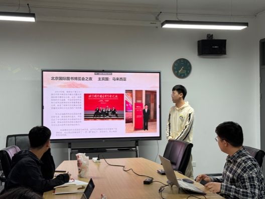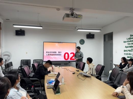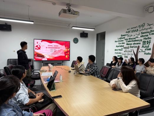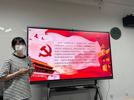 理论学习环节共分为两部分。首先,入党积极分子唐晓峰及入党申请人秦昌盛向与会同志分享了外事外交活动的经验和心得体会。唐晓峰同志分享了自己参加第三十一届北京图书博览会开幕仪式暨北京国际图书博览会之夜以及第十八届中华图书特殊贡献奖颁奖仪式的筹办经历,表达了身为当代青年将更加积极地投身到中华文化传播的伟大事业中的决心。秦昌盛同志则从自己参加泰国农业文化资产遗产管理与保护研修班以及在智库实习的经历出发,深刻感受到我国正通过农业领域涉外援助践行人类命运共同体理念,也切实体会到国家以二轨外交为重要途径,积极传播中国智慧的责任担当。其次,宣传委员罗雪婷结合919日播出的2025年高校党组织示范微党课第二期第二讲的内容,带领与会同志进行理论学习,深刻体会习近平总书记对于教育强国的指示精神。