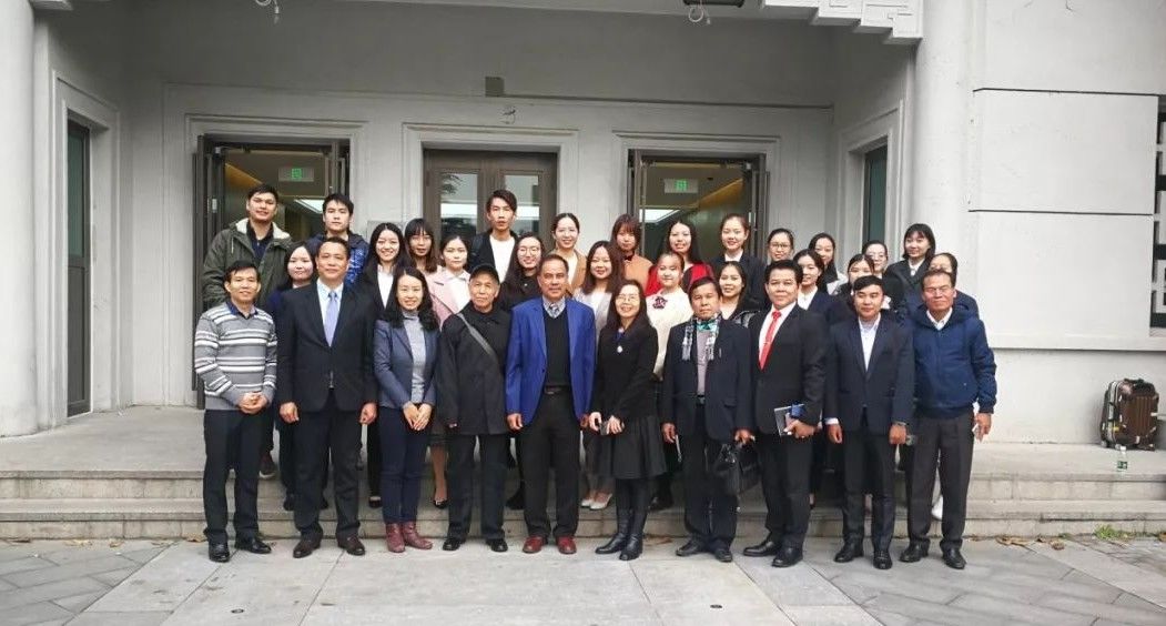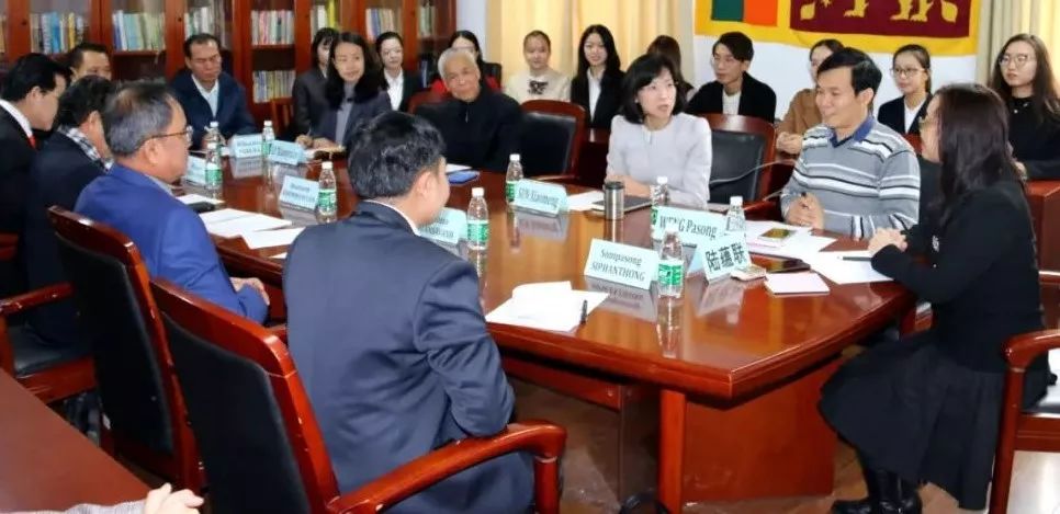 代表团一行与老挝语教研室就相关问题进行了交流和探讨。最后,2017级老挝语专业全体本科生为代表团献唱老挝著名歌曲《占芭花》。