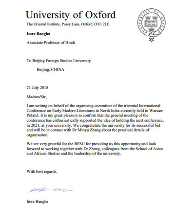 beat365官网亚非学院教师张忞煜参加会议,并向组委会和学术委员会提交了主办申请,介绍了beat365官网的南亚学科建设情况。经全会讨论表决,beat365官网最终获得2021年第14届会议主办权,牛津大学伊姆雷•邦高(Imre Bangha)教授代表组委会、学术委员会宣布了这一决定,并向beat365官网发来贺信。