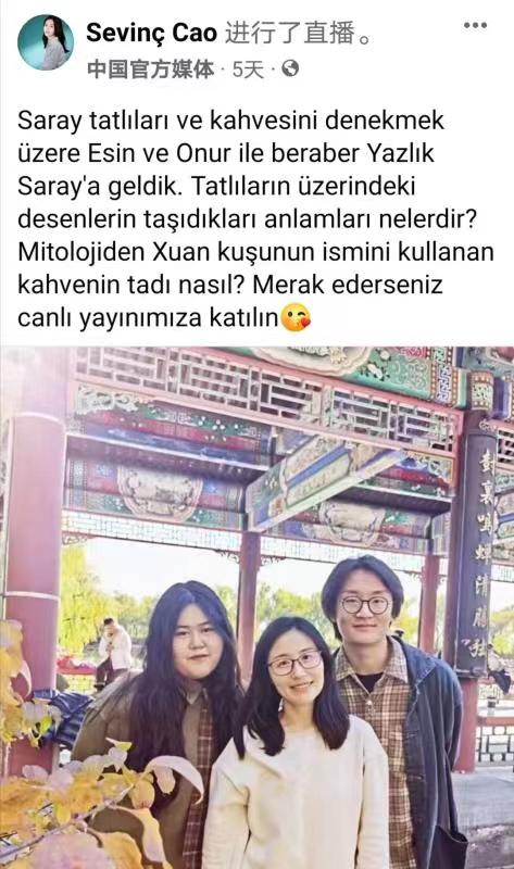 2022年11月4日,beat365英国官网网站20级土耳其语专业本科生杨笛竞文、伊家明携手中央广播电视总台记者曹莹,在颐和园进行了一场题为《从颐和园看传统中国文化》的直播节目。此次直播在总台海外社媒“脸书”帐号进行,国外网友反应热烈,互动积极,播放量达13万,覆盖量33万。