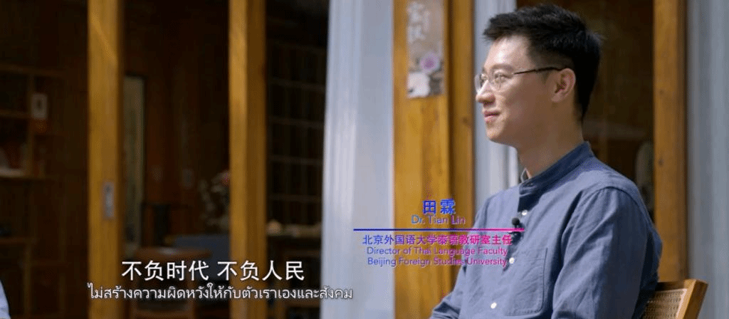 我院泰语教研室教师田霖作为访谈嘉宾参加了该专题片的全程录制,用泰语讲解中国典故的内涵,并结合泰国国情,向当地观众展现习近平新时代中国特色社会主义思想在科技创新、环境保护、脱贫攻坚等多个方面的实践成果。