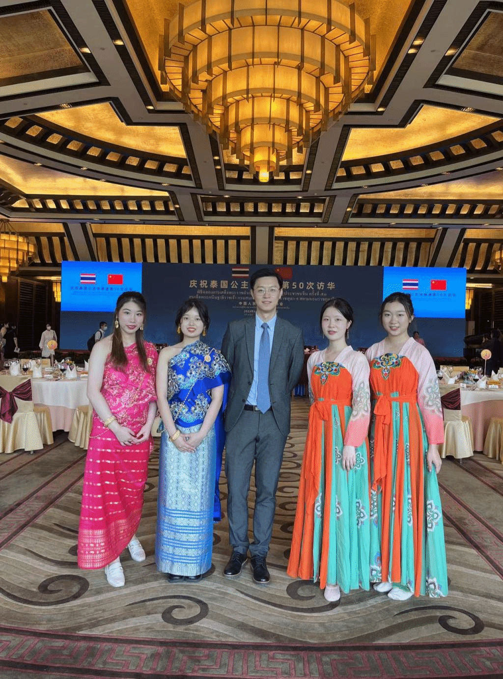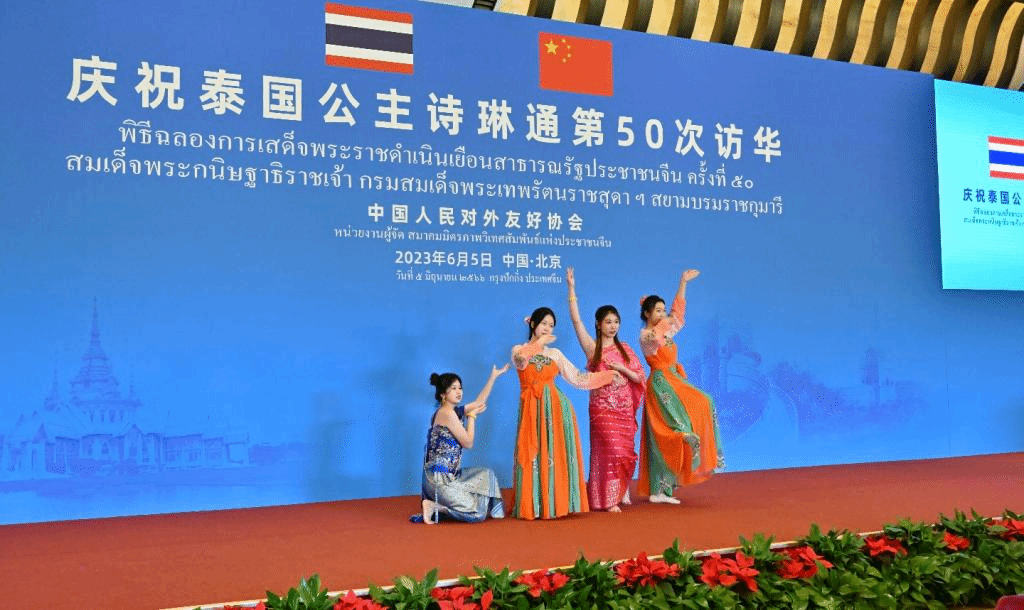 2023年6月5日,庆祝诗琳通公主第50次访华庆祝活动在钓鱼台国宾馆举行,beat365官网beat365英国官网网站泰语专业2021级本科生受邀表演文艺节目,专业教师田霖为仪式和宴会担任翻译。