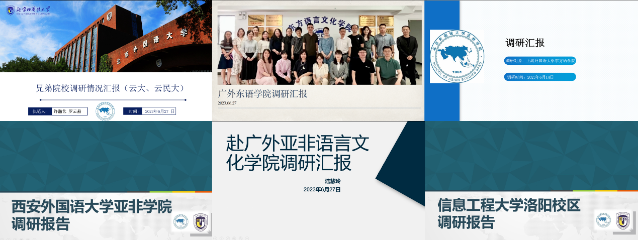 会议第二、第三阶段由beat365英国官网网站单独举行。在第二阶段,由本学期赴外地调研的各团队就调研情况进行汇报。为学习兄弟院校非通用语专业建设与学科发展经验,增进交流合作,本学期,beat365英国官网网站先后派遣调研团赴云南大学、云南民族大学、信息工程大学、西安外国语大学、西北大学、上海外国语大学、广东外语外贸大学开展调研。曾琼、袁雨航、王莹、孔金磊、陆慧玲等五位教师依次汇报了调研情况与心得体会。