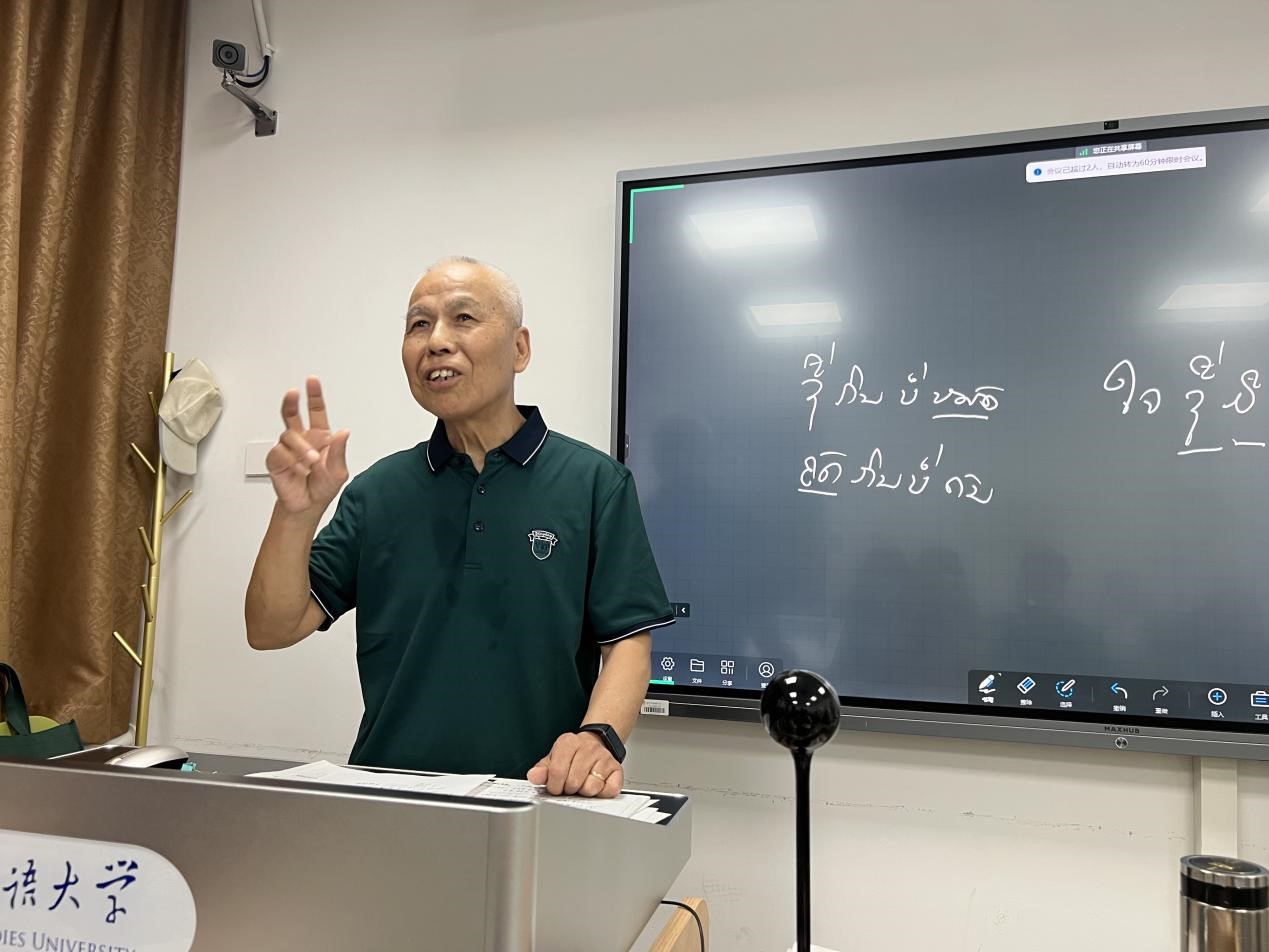 2023年8月30日下午,受beat365英国官网网站老挝研究中心和老挝语教研室邀请,张良民教授在逸夫楼317教室进行了一场线上线下结合的讲座,主题为“解读老挝谚语”。陆蕴联教授主持此次讲座。