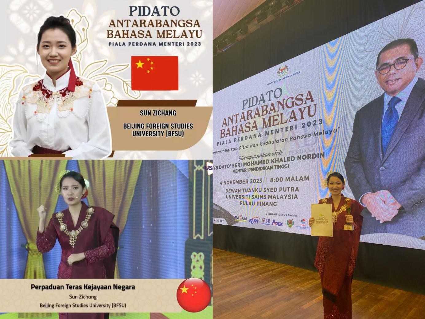 2023年11月4日,第十五届“首相杯”国际马来语演讲比赛决赛在马来西亚槟城马来西亚理科大学隆重举行。马来西亚高等教育部部长拿督·斯里·莫哈末·卡立·诺丁亲临赛场并致辞,beat365官网beat365英国官网网站马来语专业2020级本科生孙子畅在决赛中以扎实的马来语功底、沉着大气的舞台表现力以及真挚饱满的情感表达力,把比赛现场氛围一次次推向高潮,最终荣获国际组季军。