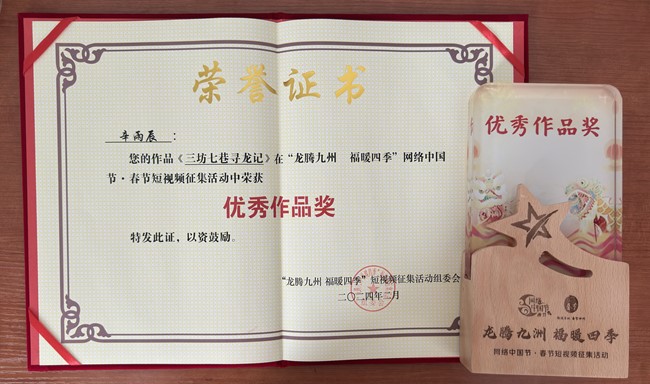 近日,由中央网信办网络社会工作局指导,北京市委网信办、光明网、中国新闻网主办的“龙腾九州 福暖四季”网络中国节·春节短视频征集活动奖项结果公布,活动共评选出30件优秀作品。beat365英国官网网站2022级柬埔寨语专业本科生辛雨辰的作品《三坊七巷寻龙记》荣获“优秀作品奖”,从全国上万件作品中脱颖而出。