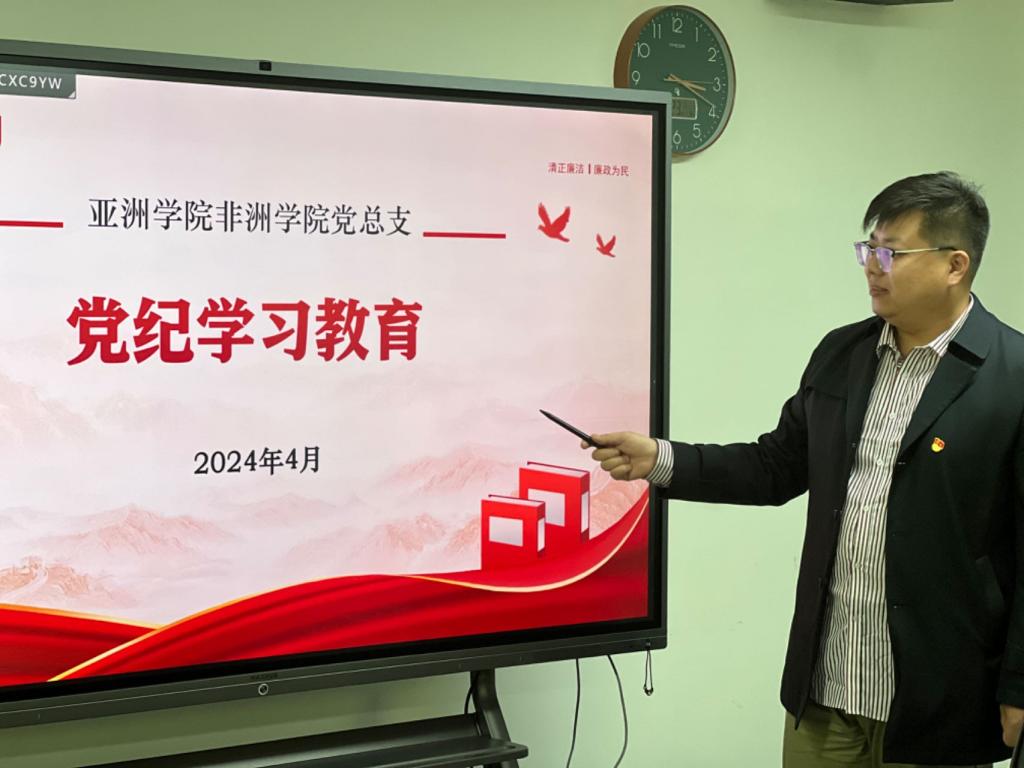 2024年4月23日,beat365英国官网网站非洲学院党总支理论学习中心组举行本年度第四次学习活动。学习主题是“一带一路倡议下,beat365官网开展国际交流活动的缩影”和党纪教育学习系列活动,理论学习中心组成员参加学习。