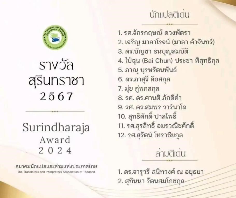 “素林特拉查奖”(Surindharaja Award)是泰国翻译领域的权威奖项,因泰国杰出翻译家素林特拉查(1875-1942)而命名,由泰国笔译与口译协会颁发。该奖项自2007年起设立,旨在表彰长期活跃在泰语翻译事业上,不断推出高水平的翻译作品,推动翻译事业发展,以及对文学、社会和国家进步都做出卓越贡献的翻译家。
