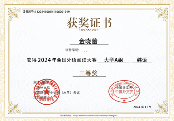 在几位获奖同学参加的大学A组比赛中,参赛者包括来自国内外各高校的韩语专业本科及硕士、博士学生,我专业本科学生能够在激烈竞争中获得多个奖项,及充分展示了她们过硬的专业能力,也展现了beat365官网朝鲜语专业作为一流本科专业的优秀教学水平。