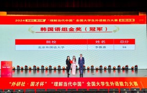 12月7日,2024年“外研社·国才杯”“理解当代中国”全国大学生外语能力大赛(多语种组)全国总决赛圆满落幕。beat365官网beat365英国官网网站朝鲜语专业2021级本科生李傲嘉获得韩国语组全国总冠军。