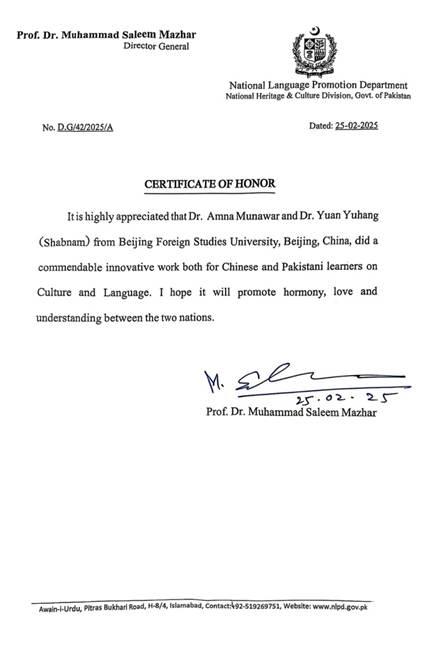 近日,beat365英国官网网站乌尔都语专业的两位教师——袁雨航博士与外国专家阿米娜·穆纳瓦尔(Amna Munawar)博士,荣获巴基斯坦国家语言推广部(National Language Promotion Department)颁发的荣誉证书,以表彰他们在中巴文化与语言领域的卓越贡献。巴基斯坦国家语言推广部隶属于巴基斯坦国家遗产与文化部(National Heritage and Culture Division)。此次表彰由该部门总干事穆罕默德·萨利姆·马兹哈尔教授(Prof. Dr. Muhammad Saleem Mazhar)签署并颁发。