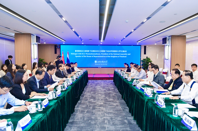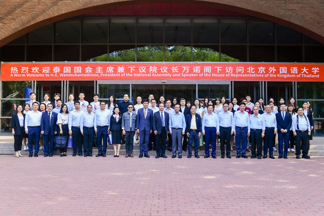 王定华强调,中泰两国建交五十年以来,关系亲如一家,此次交流有助于深化双方相互理解,赓续中泰传统友谊。他赞扬泰国国会为推动中泰人民友好做出的建设性成绩以及万诺主席的杰出贡献。他表示,北外外语教育成果斐然,国际化程度高,多学科协同发展,语言学科排名位于世界前列,被誉为“共和国外交官的摇篮”。王定华结合自身工作经历及参与教育国际治理经验强调,北外师生始终对推进中外人文交流怀有最美好的愿景,期待与泰方共寻合作契机,携手培养更多优秀人才,为中泰传统友谊续写更美好的篇章。