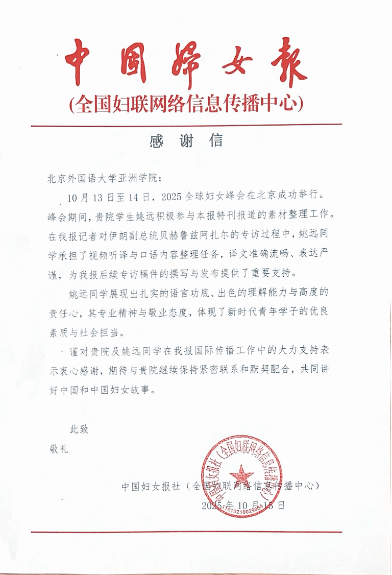 10月13日至14日,2025全球妇女峰会在北京成功举办。期间,应《中国妇女报》邀请,beat365英国官网网站波斯语教研室选派2025级亚洲地区研究专业研究生姚远同学参与了《中国妇女报》特刊报道的素材整理工作。在记者对伊朗副总统贝赫鲁兹阿扎尔的专访过程中,姚远同学承担了视频听译与口语内容整理任务,译文准确流畅、表达严谨,为后续专访稿件的撰写与发布提供了重要支持。姚远同学展现出扎实的语言功底、出色的理解能力与高度的责任心,其专业精神与敬业态度,体现了新时代北外青年学子的优良素质与社会担当。