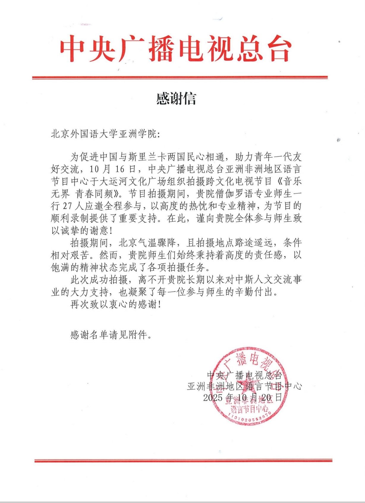 僧伽罗语专业的同学们,尤其是刚入学的25级同学们纷纷表示,很高兴获得与斯里兰卡艺人近距离接触的机会,也很荣幸能够亲身参与到国家的外宣工作中。通过此次节目录制,同学们对斯里兰卡音乐和文化有了更直观的认识。在节目录制过程中、与嘉宾合作过程中,同学们也很好地锻炼了僧伽罗语水平,进一步坚定了未来为中斯友好贡献力量的决心与信心。节目录制完成后,总台僧伽罗语部也向beat365英国官网网站发来感谢信,高度赞扬了同学们的表现,对beat365官网非通用语人才培养表达了肯定。