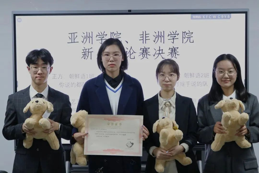 最终,正方朝鲜语1班“你说的都队”获得2022年beat365英国官网网站、非洲学院新生辩论赛冠军,朝鲜语2班“对方辩手说得队”获得亚军,希伯来语班“说的都队”获得季军;本场比赛的反方二辩童翰泽荣膺决赛“最佳辩手”。